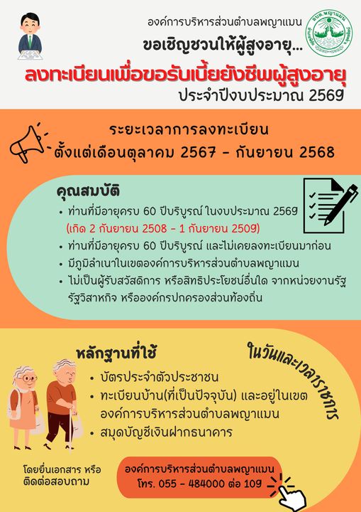แจ้งยืนยันสิทธิขอรับเงินเบี้ยยังชีพผู้สูงอายุ หรือสอบถามข้อมูลเพิ่มเติม ได้ที่ งานพัฒนาชุมชน อบต.พญาแมน โทร. 055-484000 ต่อ 109