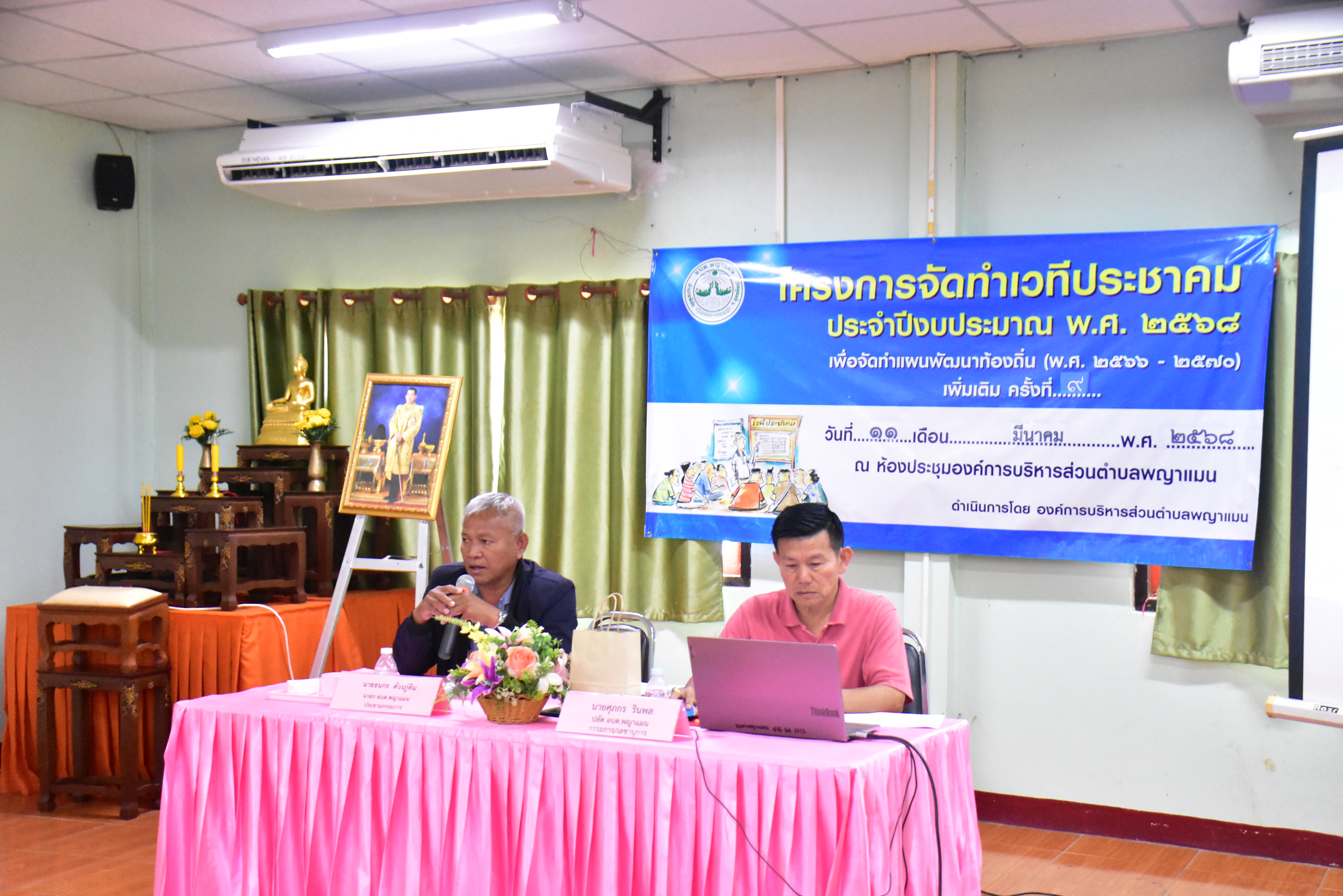 นายธนกร ด้วงภู่ทิม นายกองค์การบริหารส่วนตำบลพญาแมน พร้อมด้วย คณะผู้บริหาร, หัวหน้าส่วนราชการ, สมาชิกสภาฯ, ผู้ใหญ่บ้าน, ผู้ช่วยผู้ใหญ่บ้าน, ผู้อำนวยการโรงเรียนในเขตตำบลพญาแมน ร่วมประชุมโครงการจัดทำเวทีประชาคม ประจำปีงบประมาณ พ.ศ. 2568 เพื่อจัดทำแผนพัฒนาท้องถิ่น (พ.ศ. 2566 – 2570) เพิ่มเติม ครั้งที่ 9 ณ ห้องประชุมองค์การบริหารส่วนตำบลพญาแมน